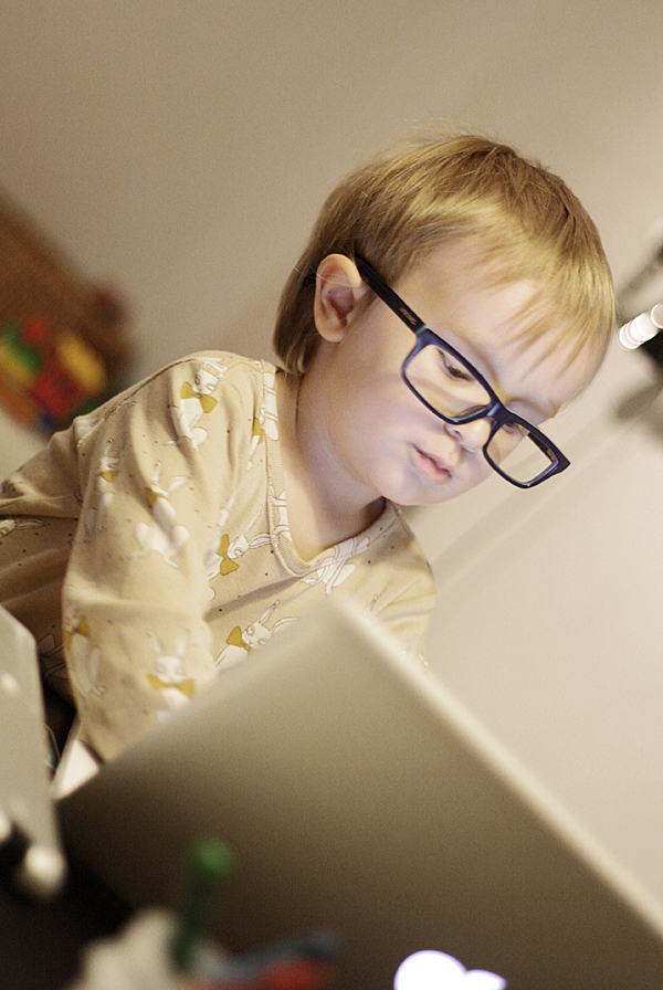 Eilen illalla poika halusi sovittaa silmälasejani, ja ne päähänsä saatuaan hän juoksi pöydän ääressä olevan läppärin ääreen ja alkoi hakata näppäimistöä molemmin käsin pienen apinan raivolla. Hmm.. en kyllä tunnusta, vaikka silmälaseja käytänkin usein koneella ollessani..;)
